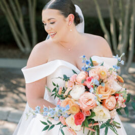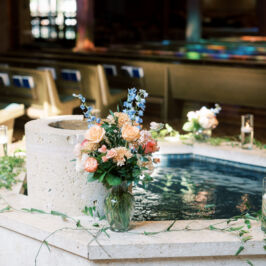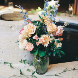 I can’t explain how gorgeous our flowers were for our wedding! The bouquets were ivory, light coral, dark coral roses, and green succulents! I worked with RJ and he was fabulous! I gave him some photos of what I liked and told him how I wanted to combine the best parts of the photos, and a color swatch of my bridesmaids dresses. He did better than I could imagine! Our centerpieces were so pretty and looked very romantic! We had 3 vases of different heights with river rock at the bottom and roses inside the water, with a floating candle on top. They came out perfect! I would use this vendor for any of my flower needs! – Maggie F.